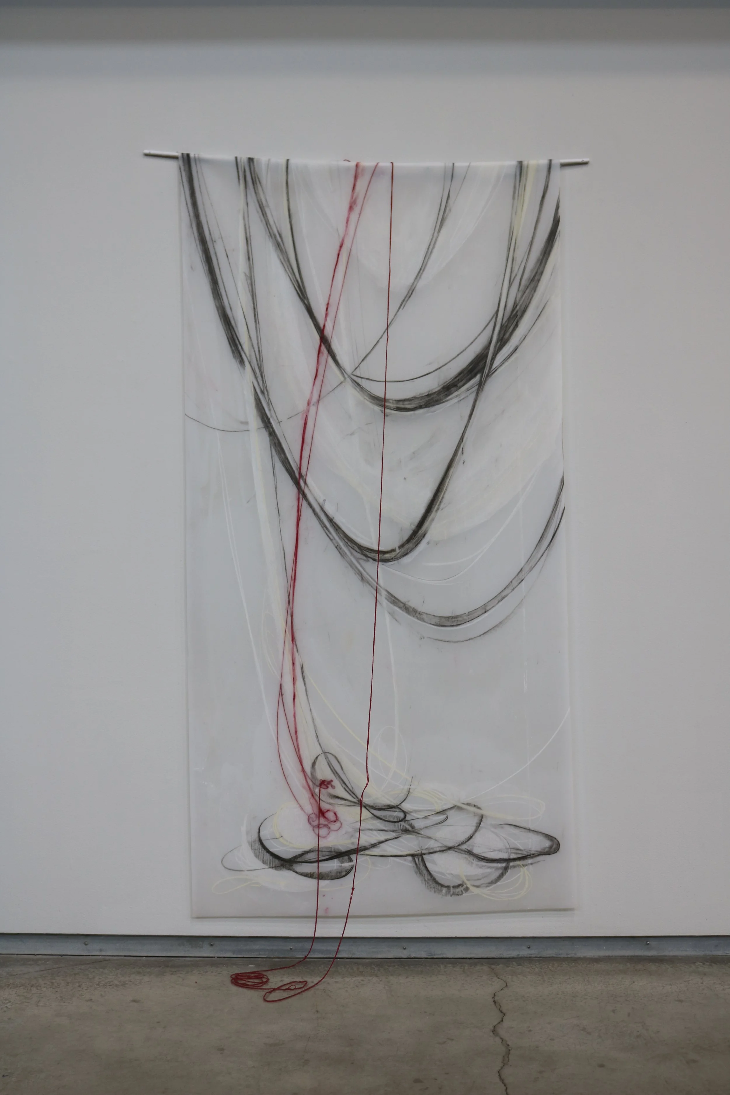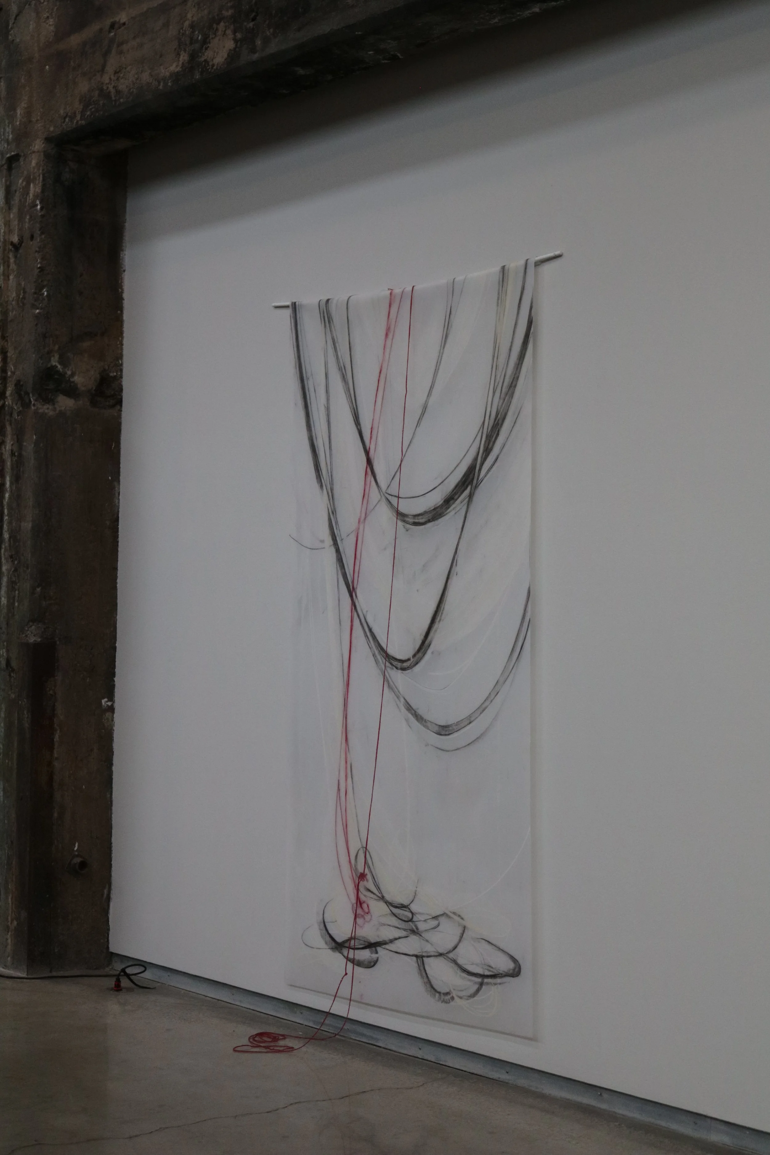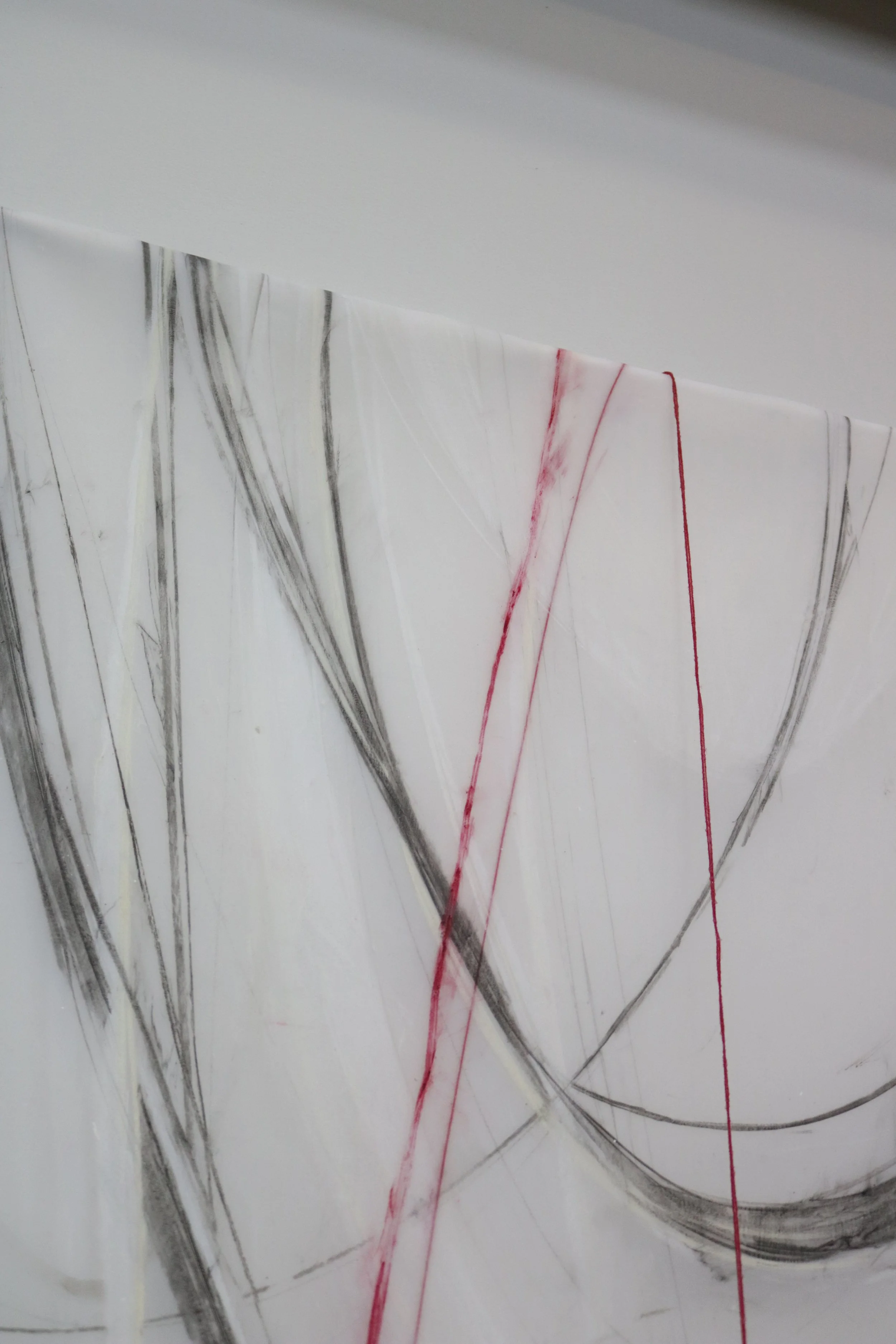 silicone monoprint with charcoal, chalk pastel, and cotton yarn